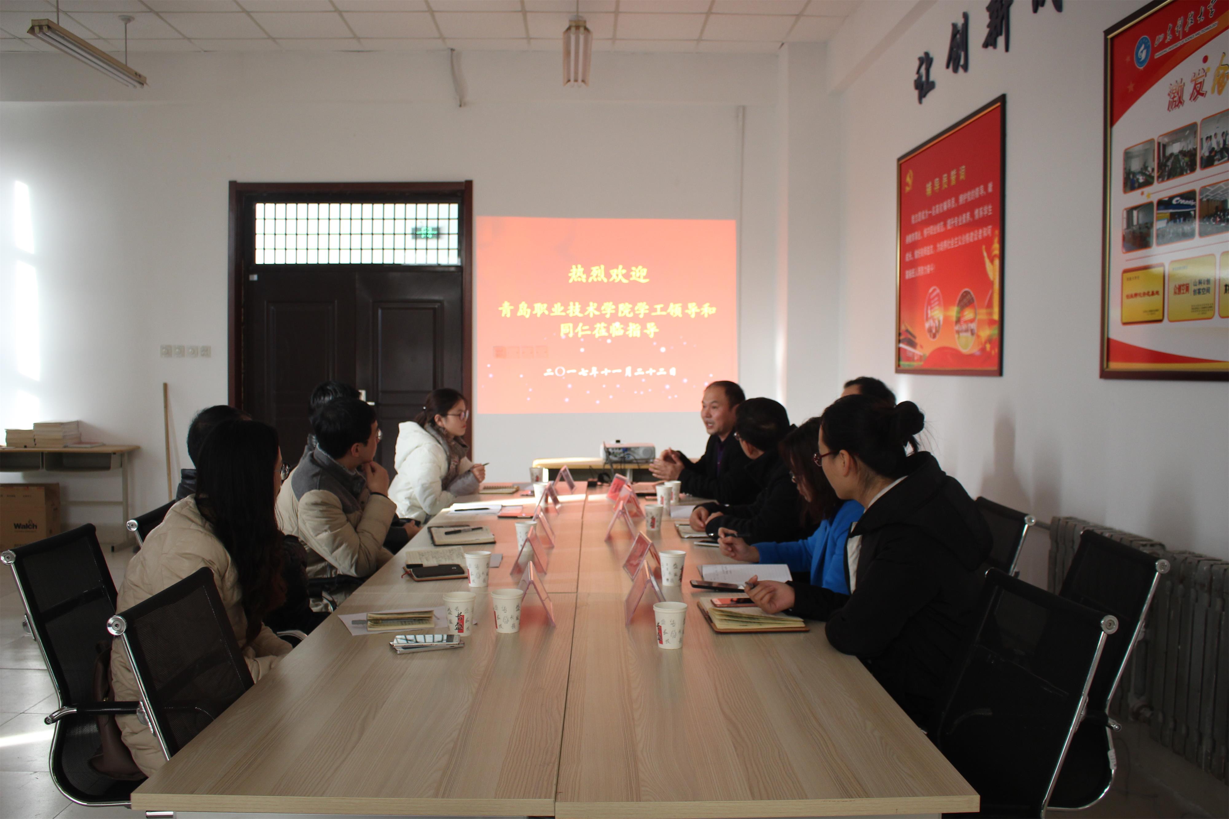 11月22日,青岛职业技术公司学生工作处处长张旭鹏一行5人来校交流、考察辅导员名师工作室建设工作。公司辅导员名师工作室主要成员接待了张旭鹏一行。宾主双方就辅导员名师工作建设情况展开座谈。