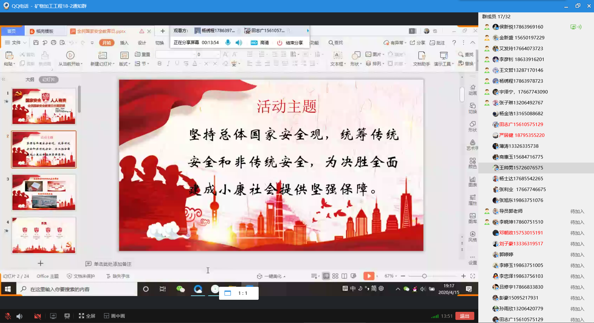 结合当前疫情防控形势和员工实际情况,各团支部采取多种线上形式举办主题团日活动。团支部组织全体成员共同观看学习教育部组织录制的2020年全民国家安全教育日高校公共课,通过学习强国平台、公司“两微一端”观看《总体国家安全观公益宣传片》、《总体国家安全观短视频》,学习了解国家安全教育知识,并结合之前参与的老员工安全知识学习答题活动,进一步深化对国家安全的认识和理解。视频学习过后,支部内展开线上讨论,支部成员分享对国家安全观的认识,交流心得,相互促进。有些支部适时开展家庭安全隐患排查工作,支部成员对家中可能存在安全隐患的设施、行为进行排查改正,确保居住环境的安全。