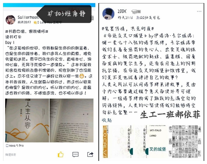 活动开始后,员工们积极报名参与,加入活动QQ群,通过QQ空间、朋友圈等社交平台连续三天分享读书心得,推荐喜爱书籍。工艺19-2班陈宣成读《毕淑敏散文集》有感,生活中总有一种女孩,容颜清丽却不艳色妖娆,这种由内而外的东西,就是气质。矿加19-3班唐静谈《愿人生从容》,人生从容来自内心,我们应该听从自己的内心,走最适合自己的路,不随波逐流,也不顺从命运。同学们发表自身心得,阅读他人感悟,感受书墨带来的安宁与恬淡,遨游在书籍的海洋里。经过角逐筛选,陈宣成等九名员工的读书心得获评本次活动优秀奖。