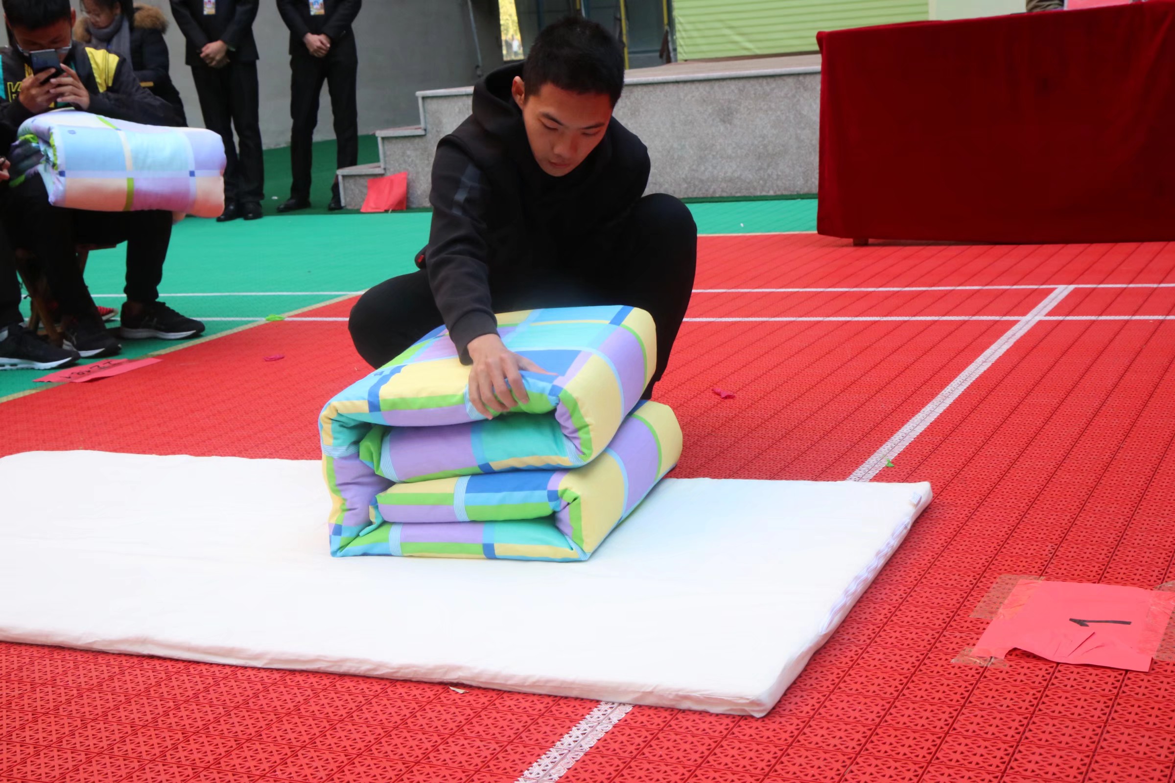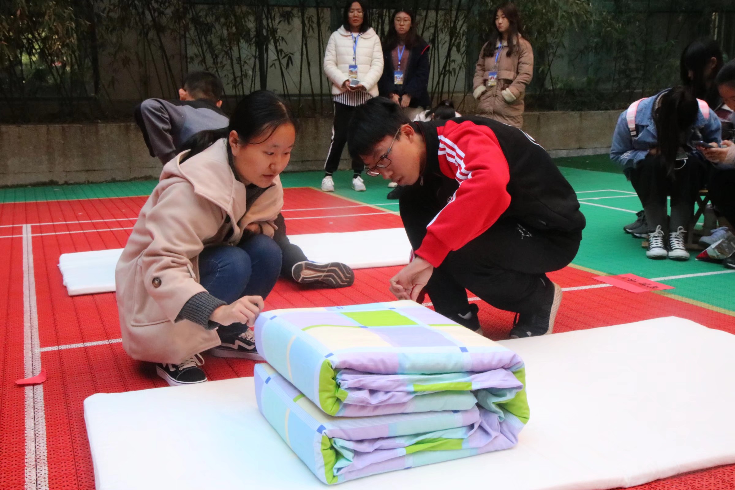 首先由徐华坤老师发表讲话,他表示此次军被大赛将军训学习的技能融入到现实生活中,为营造良好的宿舍环境创造了机会。比赛分为四轮,分别为班级个人叠被、个人蒙眼叠被、男女两人单手合作叠被、个人完成指定动作进行叠被。参赛人员以极为认真的态度快速完成了比赛任务,一个个细致入微的动作,一张张认真严肃的面容,体现了大一新生在军训中所锻炼出来的踏实肯干的作风。现场气氛紧张热烈,观众们的掌声、助威声连成一片。大赛中的游戏环节增强了台上与台下同学的互动性,学长学姐的助力表演更是将比赛推向了高潮。