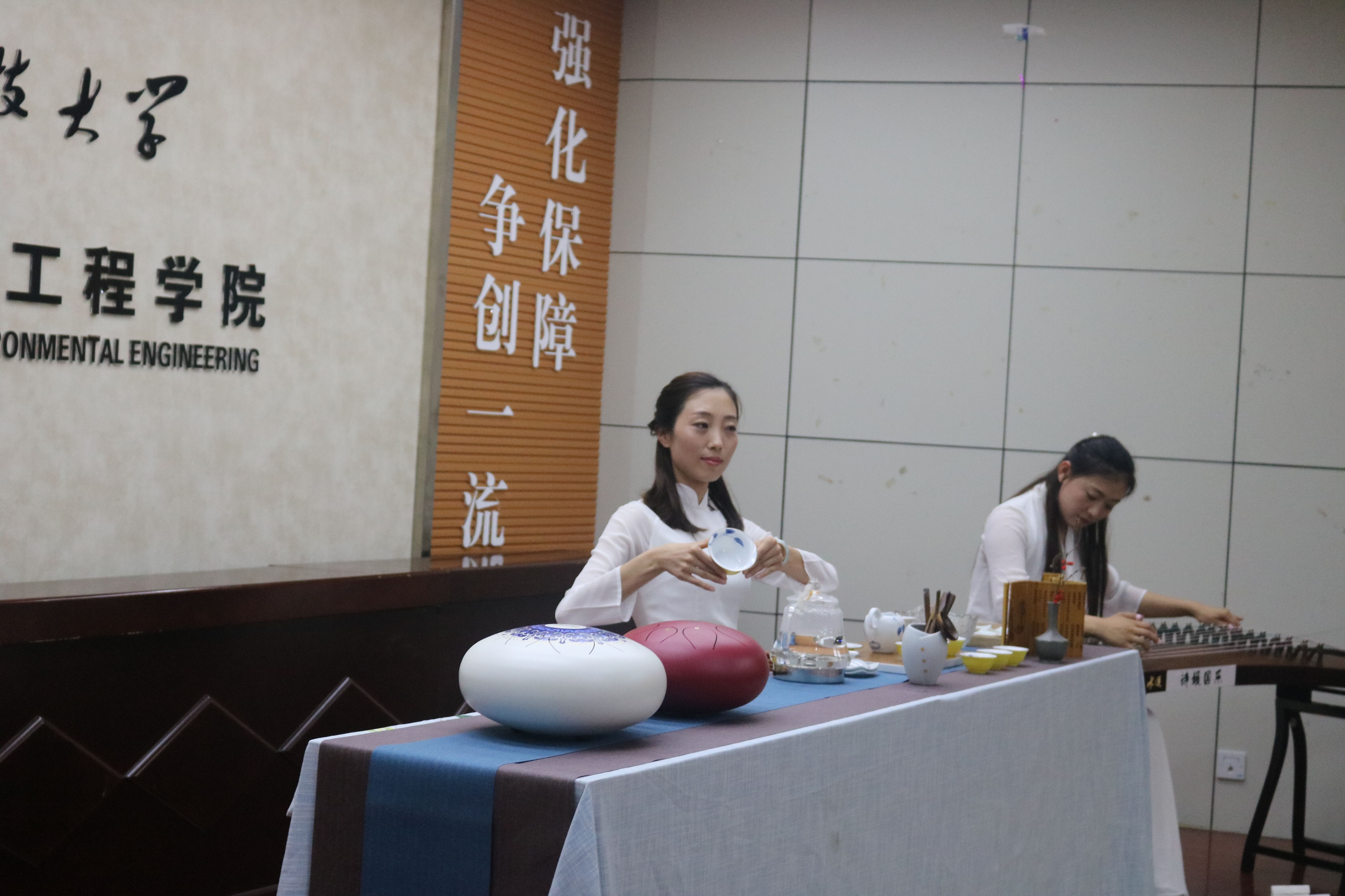 此次茶艺会主题为“化造物之工,赏茶艺之美”。力求展现茶艺文化的独特之美。活动初始,刘晶女士以生动有趣的语言细致地讲解了茶文化相关知识,让在场的观众获益匪浅。接下来,在刘晨晨女士的古筝伴奏下,进行了赏心悦目的各式茶艺表演。茶艺表演者气质非凡、翩然出尘,古筝弹奏者仙气十足、技艺纯熟,为在场观众带来了一场又一场视听盛宴。活动现场还以抽奖的形式每场选出几位幸运观众现场品茶。随后,台下观众踊跃发言,表达感悟,提出疑问,刘晶、刘晨晨两位女士与观众良好互动,耐心解答。最后,各位老师及嘉宾合影留念,活动落下了帷幕。
