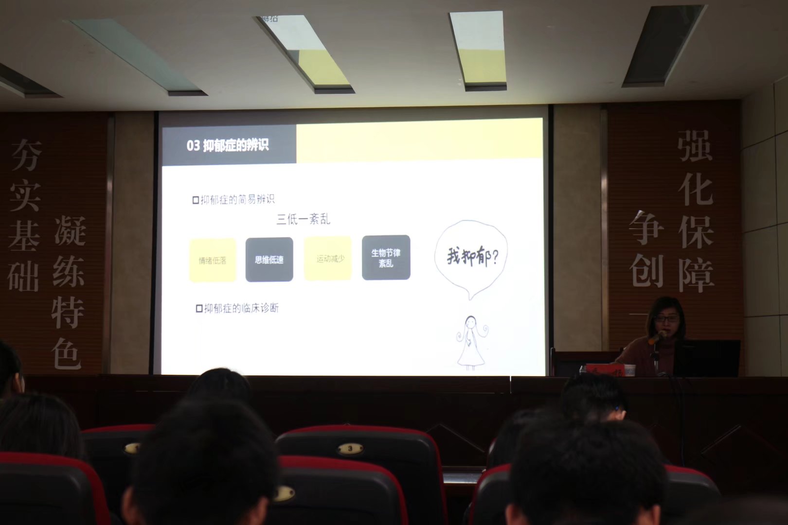 讲座开始前,工作人员播放了精心挑选的暖场沙画视频,为整个会场营造出温馨的氛围。乔杨老师利用有趣的漫画和专业文献知识详细地向同学们讲解了抑郁症的特征表现,并特别强调了抑郁症和普通情绪的区别,以及我们该怎样面对及帮助抑郁症患者等相关问题。同时乔杨老师列举了名人事例和她接触的一些抑郁症患者的例子,使同学们更加深入地了解了抑郁症。