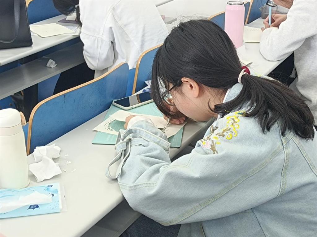 为让同学们更直观、更全面地了解剪纸传统文化,4月18日,BB贝博艾弗森刀下飞花剪纸社举办了“纸上雕花,邂逅光影”第二期活动,此次活动由剪纸社社长胡洁主持,主要内容是学习制作纸雕灯。活动伊始,胡洁首先向在场同学科普纸雕灯的相关知识,她介绍纸雕灯是一种利用剪纸的镂空技术,通过不同层的剪纸作品的叠加,形成的一种剪纸工艺品。随后,胡洁向在场同学展示制作纸雕灯需要用到的材料工具,同时介绍使用剪纸工具时要注意的几点事项。科普结束后,主持人给大家提供剪纸模板进行制作学习。大家互相交流学习,讨论纸雕灯的制作技巧,其乐融融,在一刀一刻中体验纸雕灯的乐趣,领略到非遗剪纸艺术的魅力火花,体现出刀下飞花剪纸社的和乐氛围。