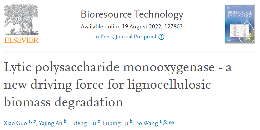 2022年8月19日,BB贝博艾弗森化学与生物工程公司王博教授科研团队以裂解性多糖单加氧酶为主题获得新进展。相关成果以Lytic polysaccharide monooxygenase - a new driving force for lignocellulosic biomass degradation为题在线发表在国际学术期刊Bioresource Technology上(中科院一区,最新IF = 11.8883)。