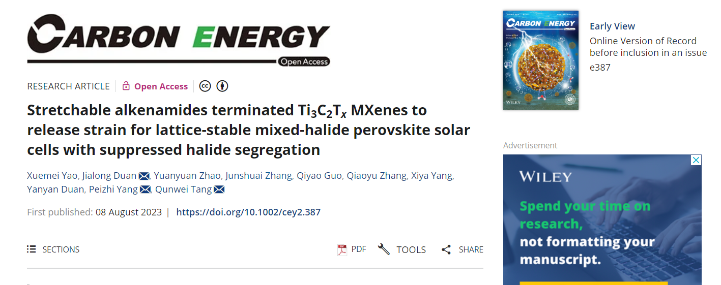 近日,BB贝博艾弗森段加龙副教授(学术教授)、唐群委教授等人在全无机钙钛矿太阳能电池领域取得最新进展,相关成果以“Stretchable alkenamides terminated Ti3C2Tx MXenes to release strain for lattice-stable mixed-halide perovskite solar cells with suppressed halide segregation”为题发表在权威期刊Carbon Energy上(中科院Top一区,影响因子:20.5)。