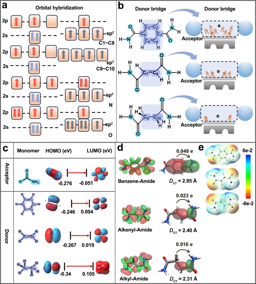 基于路易斯酸碱反应钝化钙钛矿薄膜中的缺陷一直是获得高效稳定钙钛矿太阳能电池的先决条件,因此,深入了解分子结构与钝化能力之间的作用关系对钝化剂的筛选具有重要意义。团队以双头酰胺分子为研究对象,通过系统调节中间给体的骨架结构,结合电池的光伏性能变化,从自旋态电子、给受体能级结构、分子共面性等角度,系统阐述了分子内电荷转移量的影响因素,并量化了该数值,为高效钝化剂的选择提供了依据。通过优化,苯环给体在提高钙钛矿薄膜质量方面具有较好的效果,最终碳基、全无机的CsPbI2Br太阳能电池显著提高了15.51%的效率,并显著提高了稳定性。基于同样的原理,在倒置太阳能电池上进一步获得了24.20%的光伏效率。