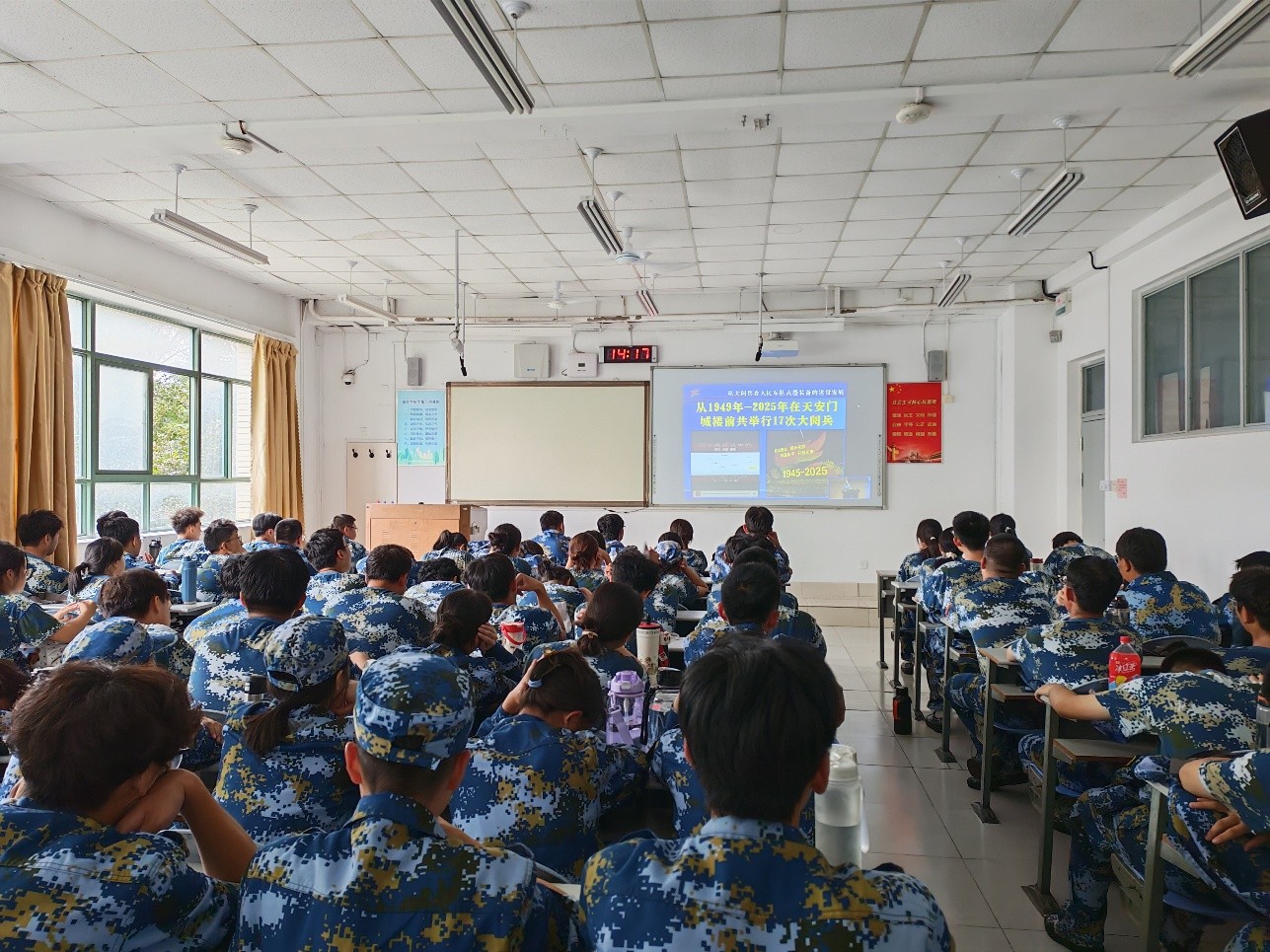 观看过程中,同学们全神贯注,深刻感受到人民军队武器装备从引进仿制到自主创新的跨越式发展。当画面呈现2025年最新阅兵盛况时,同学们更是激动不已,为祖国日益强大的国防科技实力感到自豪。