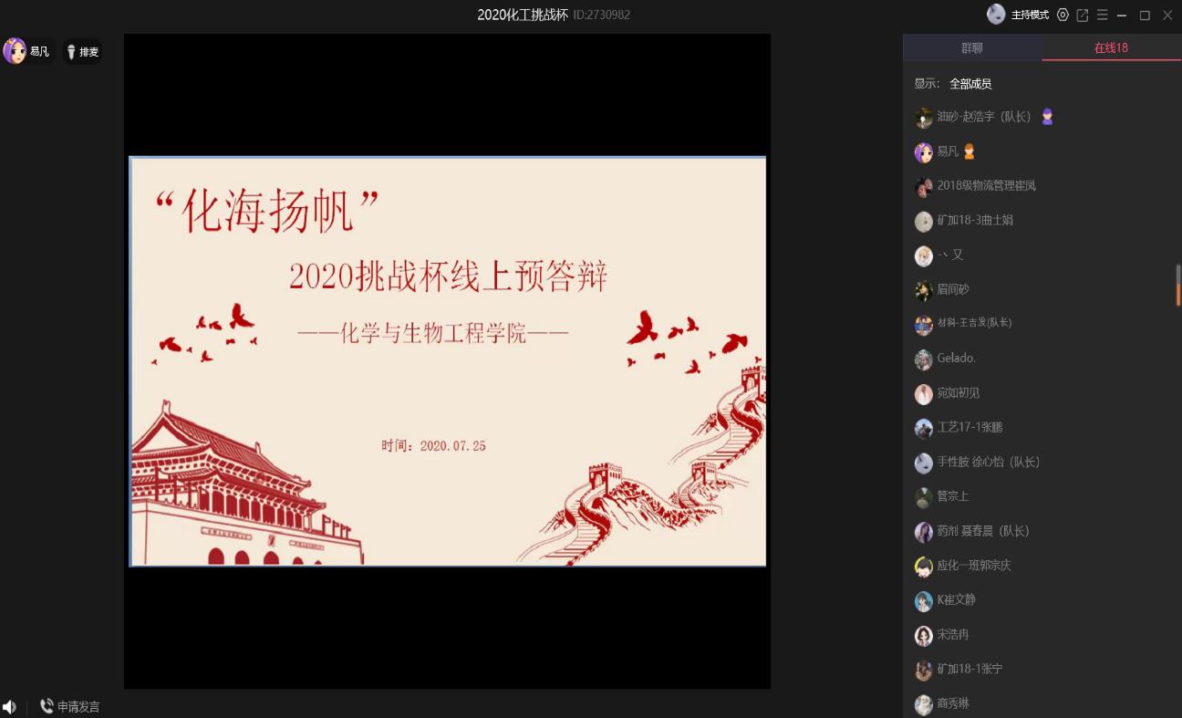 7月25日下午,BB贝博艾弗森举行“化海扬帆”2020年挑战杯线上预答辩活动。本次活动由团委书记易凡主持,各团队参赛队员、指导教师代表参加此次线上预答辩。活动开始,易凡老师介绍了本次线上预答辩的目的、流程。随后,各团队答辩队员按照顺序依次进行了各项目的展示汇报,最后,易凡老师不但就各位同学的答辩表现给出意见和建议,而且认真听取了各团队关于比赛演练的进一步计划。本次线上预答辩活动,帮助参赛团队认识到了项目中的不足,指明了下一步改进的方向,提高了同学们竞赛答辩的应对能力。各参赛团队感受到了公司老师对挑战杯比赛的支持,表达了要全力以赴让项目走得更远的信心和决心。