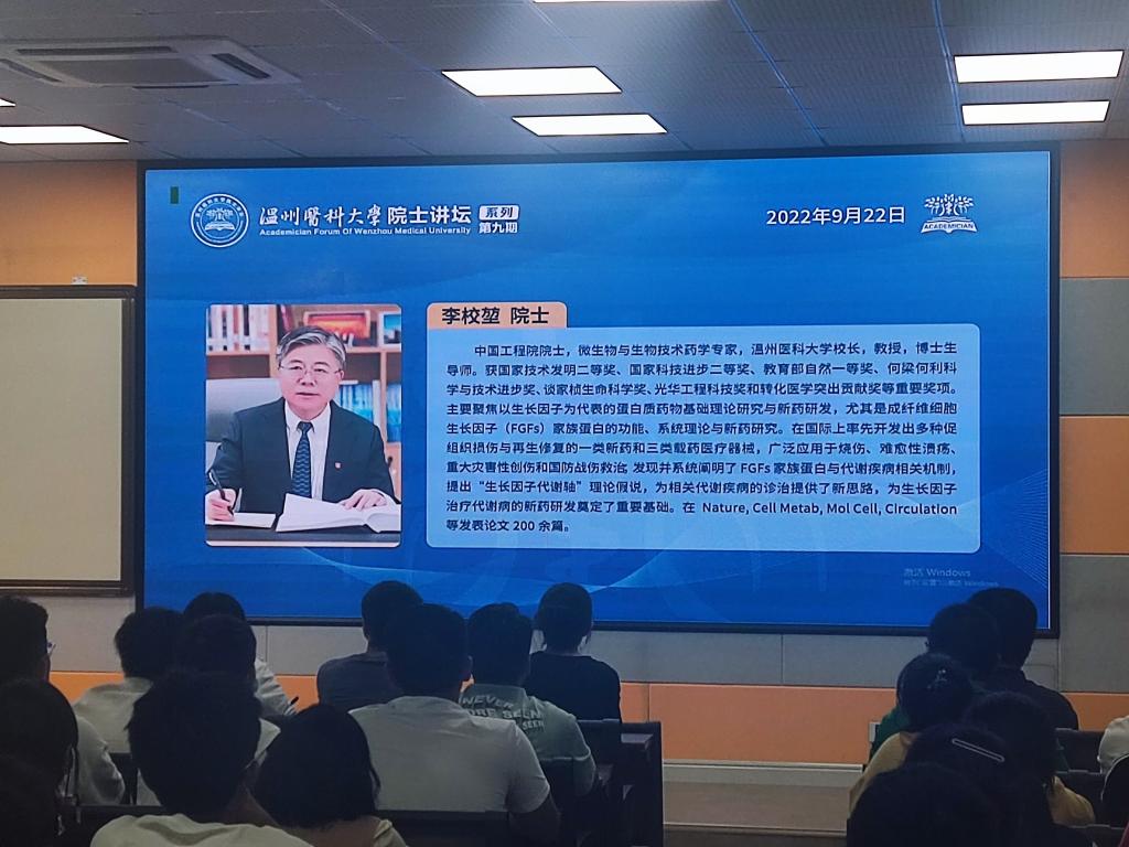 讲座在温州医科大学线下开展,我院生物工程系主任王博教授、新生班主任及全体2022级新生聆听了同步课堂讲座。