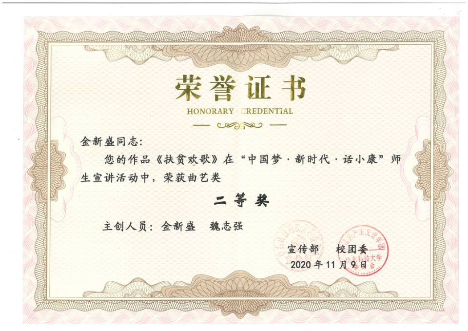 近日,公司员工金新盛、魏志强合作的相声作品《扶贫欢歌》在“中国梦·新时代·话小康”师生宣讲活动中,荣获曲艺类二等奖。