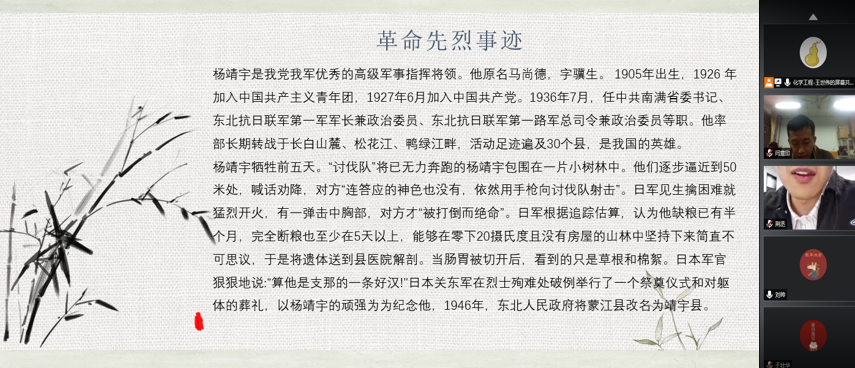 为传承红色精神,缅怀革命先烈,增强老员工的历史责任感和使命感,4月4日,硕研2019学硕团支部开展了“传承红色经典,致敬革命先烈”清明节专题云团日活动。本次活动由团支部书记王世伟主持,支部全体成员在线参与。活动伊始,团支部书记在线分享了几位革命先烈的英勇事迹,让同学们体会到了今天和平盛世的来之不易。随后,大家一同观看专题影片,学习党一百年来波澜壮阔的历史,以在线献花、发表感言的方式致敬先烈。最后,大家就当代老员工如何在日常生活中继承和发扬红色精神这一论题,畅所欲言。活动结束后,同学们纷纷表示,要铭记革命先烈的伟大功绩,珍惜当下来之不易的幸福生活,努力学习,增长才干,做社会主义事业坚定的捍卫者和建设者。