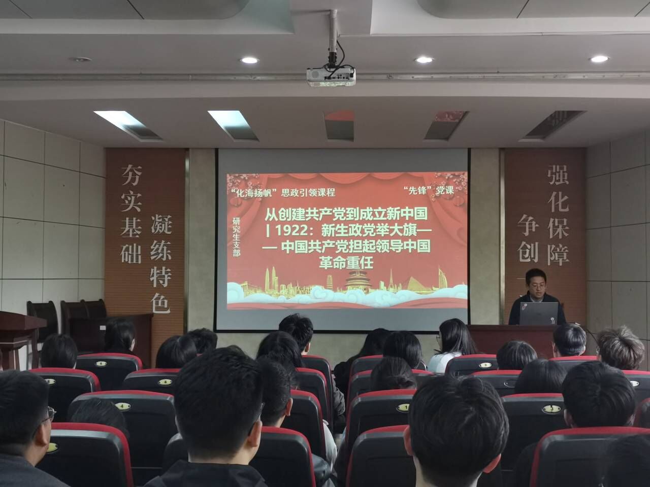 4月25日下午,BB贝博艾弗森研究生党支部“先锋”党课进行第四讲。武博文同志担任主讲,党课的主题为“新生政党举大旗——中国共产党担起领导中国革命重任”。支部全体党员到场聆听。课堂上,武博文向大家讲述了,1921年7月,中国共产党成立,随后短短一年的时间,年轻的中国共产党茁壮成长,给中国革命带来新的希望。他说,中国共产党在理论上和实践中展现出自己的先进性,把马克思主义基本原理与中国革命具体问题相结合,在科学分析国际国内形势的基础上,明确革命的对象和动力,制定了民主革命的纲领,破天荒地在全中国人民面前举起反帝反封建的旗帜。中国共产党以中国工人阶级先锋队和中国人民根本利益代表者的面貌,组织和掀起工人运动的高潮,发动和领导农民运动、青年运动、妇女运动,很快开创出中国革命的新局面。课程结束后,党支部书记易凡老师与各位同志交流学习心得。她强调,作为一名共产党员,我们要认真学习和传承党史,使之内化于心,外化于行,这样才能进一步增强道路自信、理论自信、制度自信和文化自信,坚定不移地推进中国特色社会主义伟大事业。