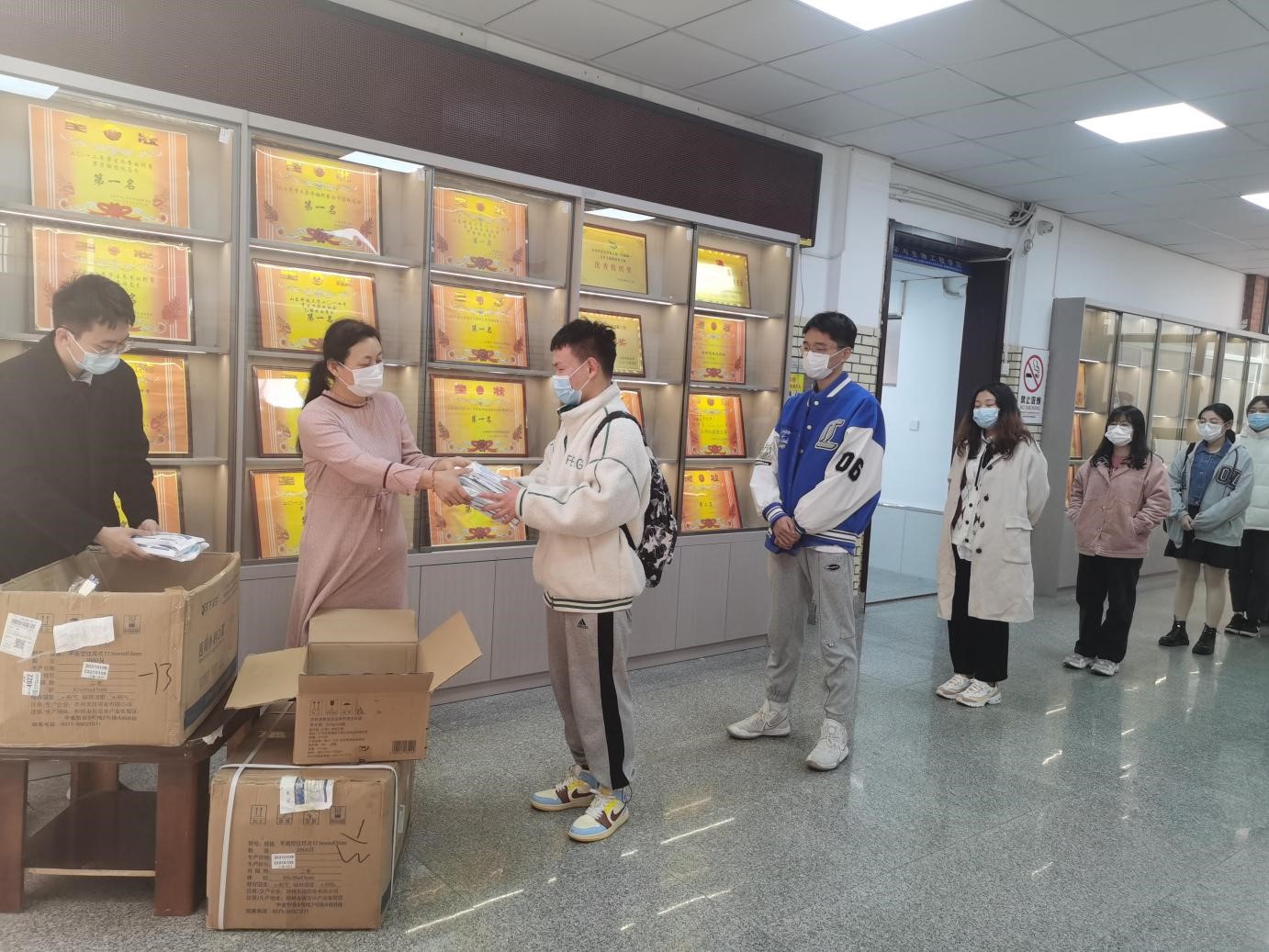 口罩作为防疫重要物资,可以有效防止病毒传染,出行佩戴口罩成为全民共克疫情的关键一招。此次发放口罩,不仅帮助师生缓解了对口罩的需求,还向师生传递出公司对待疫情防控的坚定态度,并引导他们进一步认识到佩戴口罩的必要性和重要性。为减少人员聚集现象,公司组织各系(中心)教工代表、各年级员工代表领取口罩,并及时分发给全体师生。