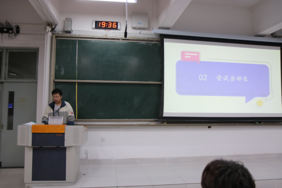 首先由王泽阳进行员工会工作经验分享,此心向阳——化三载之成长,工员工会辉煌,主要讲述了自己在员工会三年的心路旅程与成长。随后,易凡老师进行总结,讲述了自己与化工员工会之间的羁绊,希望大家能够承前人之志,领跑青春!