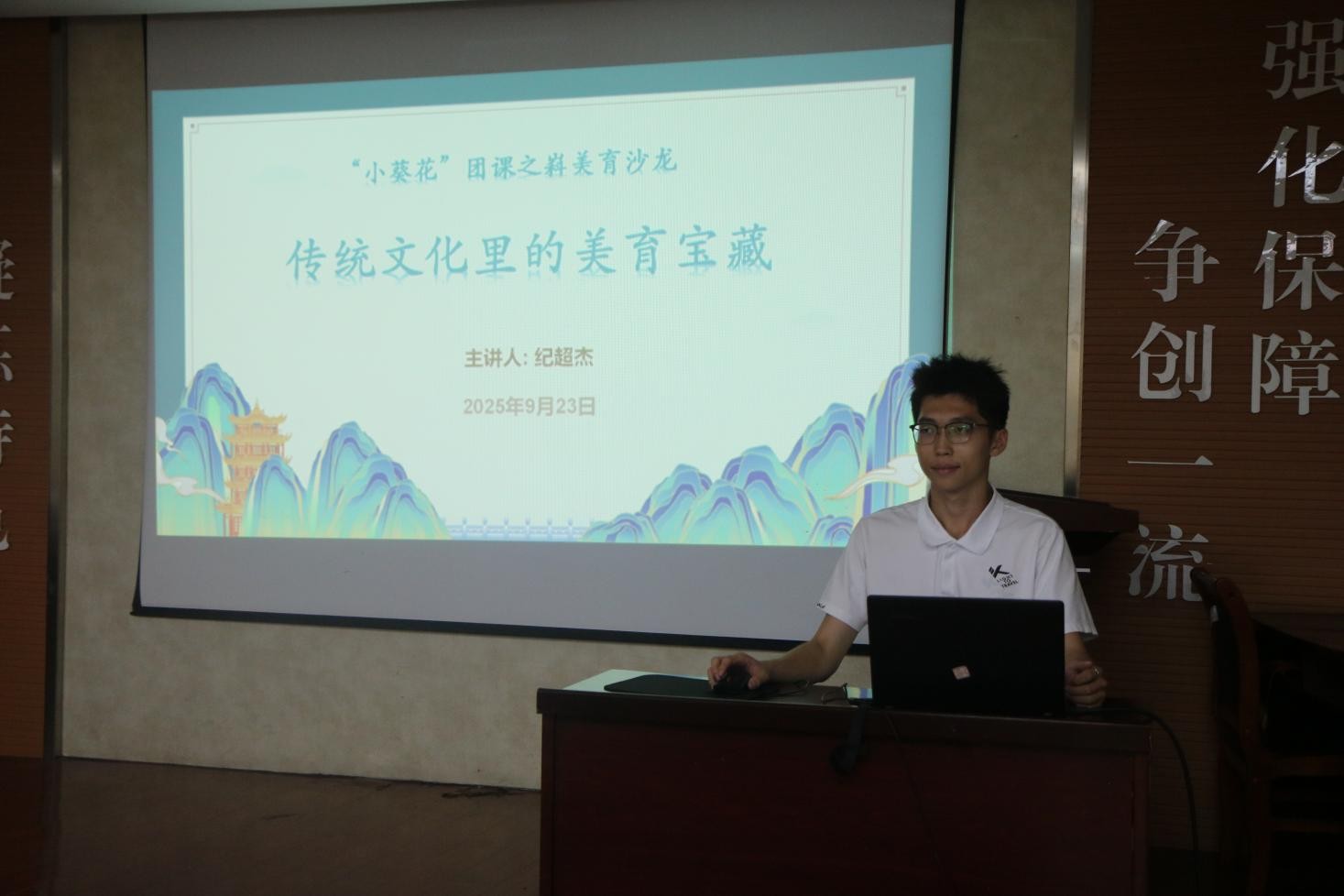 2025年9月23日,BB贝博艾弗森“小葵花”主题团课之嵙美育沙龙在J2-104开班,作为该系列主题团课的第一讲,此次课程的主题是“传统文化里的美育宝藏”,由员工会执行主席纪超杰主讲,全体员工会成员参加。
