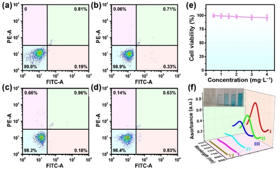 图3 (a-d)流式细胞仪表征结果;(e)细胞毒性实验结果;(f)材料过氧化物模拟酶性能研究