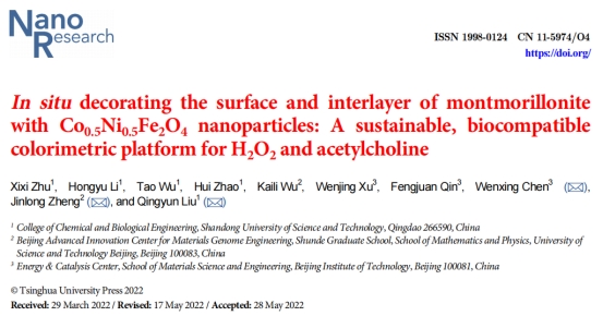 相关成果以“In situ decorating the surface and interlayer of montmorillonite with Co0.5Ni0.5Fe2O4 nanoparticles: A sustainable, biocompatible colorimetric platform for H2O2 and acetylcholine”为题发表在国产旗舰期刊Nano Research上(最新IF10.269)。论文第一作者为主曦曦高级实验师,第二作者为2020级硕士研究生李洪禹,刘青云教授为论文通讯作者。该研究得到了国家自然科学基金项目21904175,21971152、山东省“青创团队”和BB贝博艾弗森人才计划项目“菁英计划”的资助。文章链接:https://link.springer.com/article/10.1007/s12274-022-4594-x,文章DOI:10.1007/s12274-022-4594-x