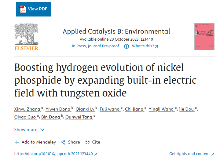 近日,BB贝博艾弗森张鑫宇(学术教授)、唐群委(教授)等人在电催化水分解制氢领域取得最新进展,相关成果以“Boosting hydrogen evolution of nickel phosphide by expanding built-in electric field with tungsten oxide”为题发表在权威期刊Applied Catalysis B: Environmental上(中科院Top一区,影响因子:22.1)。