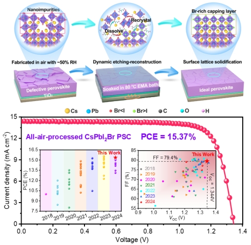 钙钛矿太阳能电池(PSCs)已经取得了令人瞩目的成就,而迄今为止报道的性能最好的电池高度依赖于制造条件,通常建立在惰性气体(氮气手套箱)或严格控制湿度的干燥空气环境中,这在技术和经济上限制了PSC的大规模商业化。造成这种限制的一个主要原因是,空气中制备的钙钛矿薄膜在整个过程中受到水分和氧气的侵蚀,不利于钙钛矿结晶,破坏相稳定性,导致大量纳米杂质缺陷的形成,尤其是在脆弱的表面。针对这个问题,团队提出了新的原位点阵刻蚀重建策略,通过将空气制造的钙钛矿膜浸泡在高温加热下的弱极性有机溶剂中,表面的缺陷态被动态溶解并选择性再结晶。由于弱溶解度和温度诱导退火效应的平衡,表面缺陷层被化学剥离(刻蚀过程),形成一个稳定的富Br层(再结晶过程),最终在无需精确控制湿度的全空气中制备了15.37%的高效率碳基CsPbI2Br器件,优于在氮气中制造的未经处理器件,并具有出色的稳定性。与先前报道的同类器件的PCEs相比,获得了可观的VOC×FF值。此策略可以通过筛选匹配的溶剂与其他杂化和无铅钙钛矿薄膜兼容,为克服加工条件的限制,推进钙钛矿光电器件提供了一条非常有效的途径。
