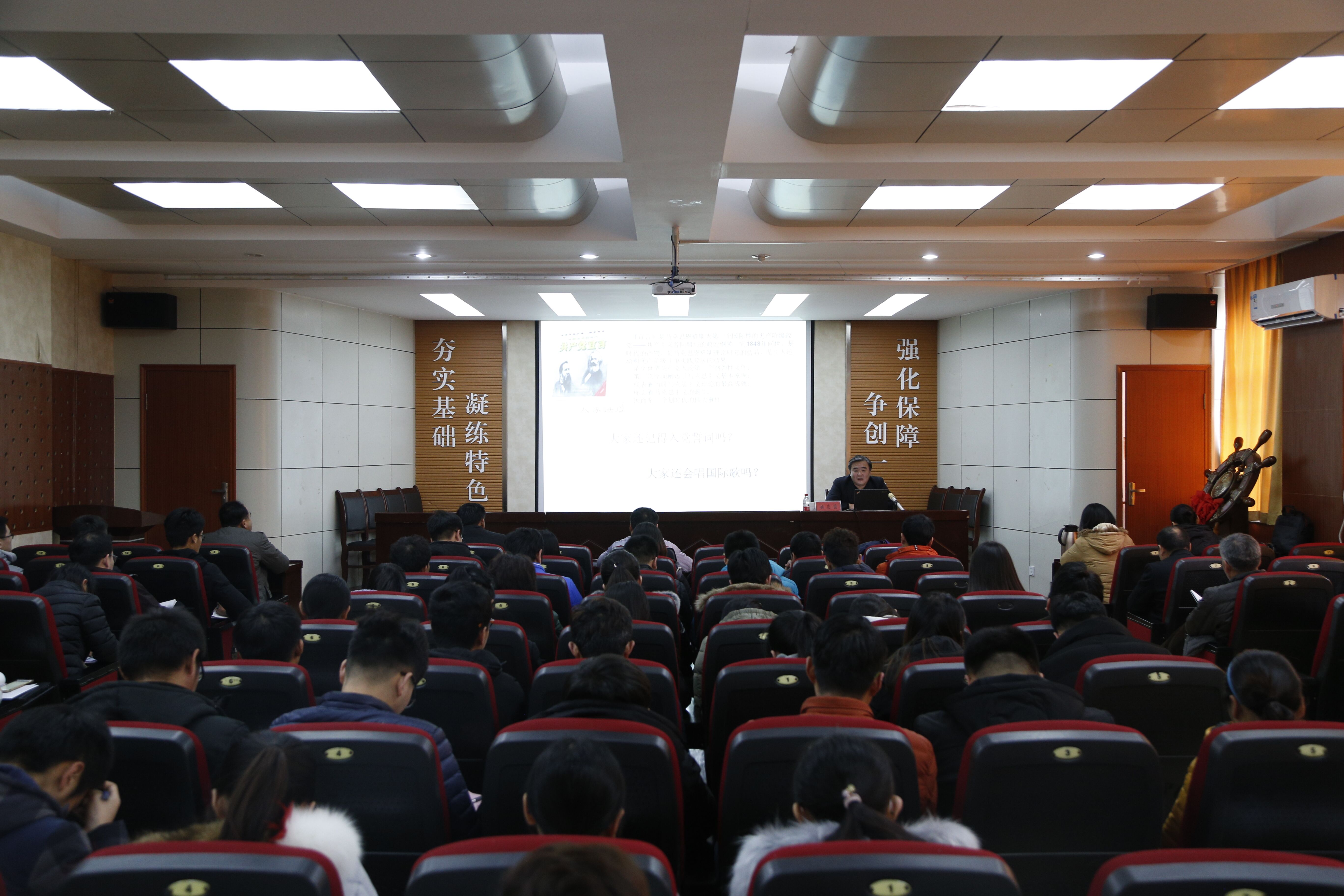 姚董事长通过“大家读过《共产党宣言》吗?”、“大家还记得入党誓词吗?”、“大家还会唱国际歌吗?”三个问题开篇,带领大家回顾中国共产党来时的路,引入不忘初心、牢记使命主题,并深刻分析了十九大的里程碑意义。随后,姚董事长从“三主·两新·一梦想”的视角,对十九大会议主题、主要成果、社会主要矛盾变化,新时代、新思想,中华民族伟大复兴中国梦进行了系统解读;深刻阐释了习近平新时代中国特色社会主义思想的鲜明特征、科学内涵及历史定位;结合翔实资料总结回顾了十八大以来党和国家事业取得的历史性成就、发生的历史性变革,并专门讲解了教育领域发生的深刻变化;根据十九大报告关于高等教育的部署要求,结合公司实际,深入分析了公司发展的目标定位、理念思路等,并号召大家立足现实、着眼未来,立足岗位、奋发有为,努力推进强校建设新征程!