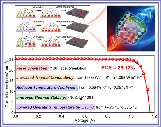 钙钛矿太阳能电池因具有光电转换效率高和制备工艺简单等优势已成为太阳能光伏领域的前沿技术。但钙钛矿太阳能电池的长期稳定性已严重制约了其商业化进程。大量研究工作聚焦于通过改善钙钛矿薄膜质量以提升晶格稳定性。在实际应用过程中,钙钛矿太阳能电池的温度会随着持续光照逐渐上升,尤其是在光照比较充足的季节,这对最大功率输出和稳定性构成挑战。针对这一行业共性关键问题,BB贝博艾弗森BB贝博艾弗森段加龙&唐群委等人创新性地研究了钙钛矿薄膜不同晶面结构与热导之间的依赖关系,揭示了混合阳离子钙钛矿中晶面依赖的热力学特性背后的机制。研究结果表明,(100)晶面具有比(110)和(111)晶面更高的热导率。通过埋入式和体相改性精确控制(100)晶面取向,目标钙钛矿薄膜的热导率可以从1.005提高到1.068 W m-1 K-1,加速了热量传输和散发,使得钙钛矿太阳能电池的平衡温度降低了5.25 oC。该项工作不仅获得了25.12%的光电转换效率,同时也表现出非常优异的热稳定性。相关成果发表在eScience期刊上,BB贝博艾弗森为第一单位,联合培养博士生李佳保为第一作者。